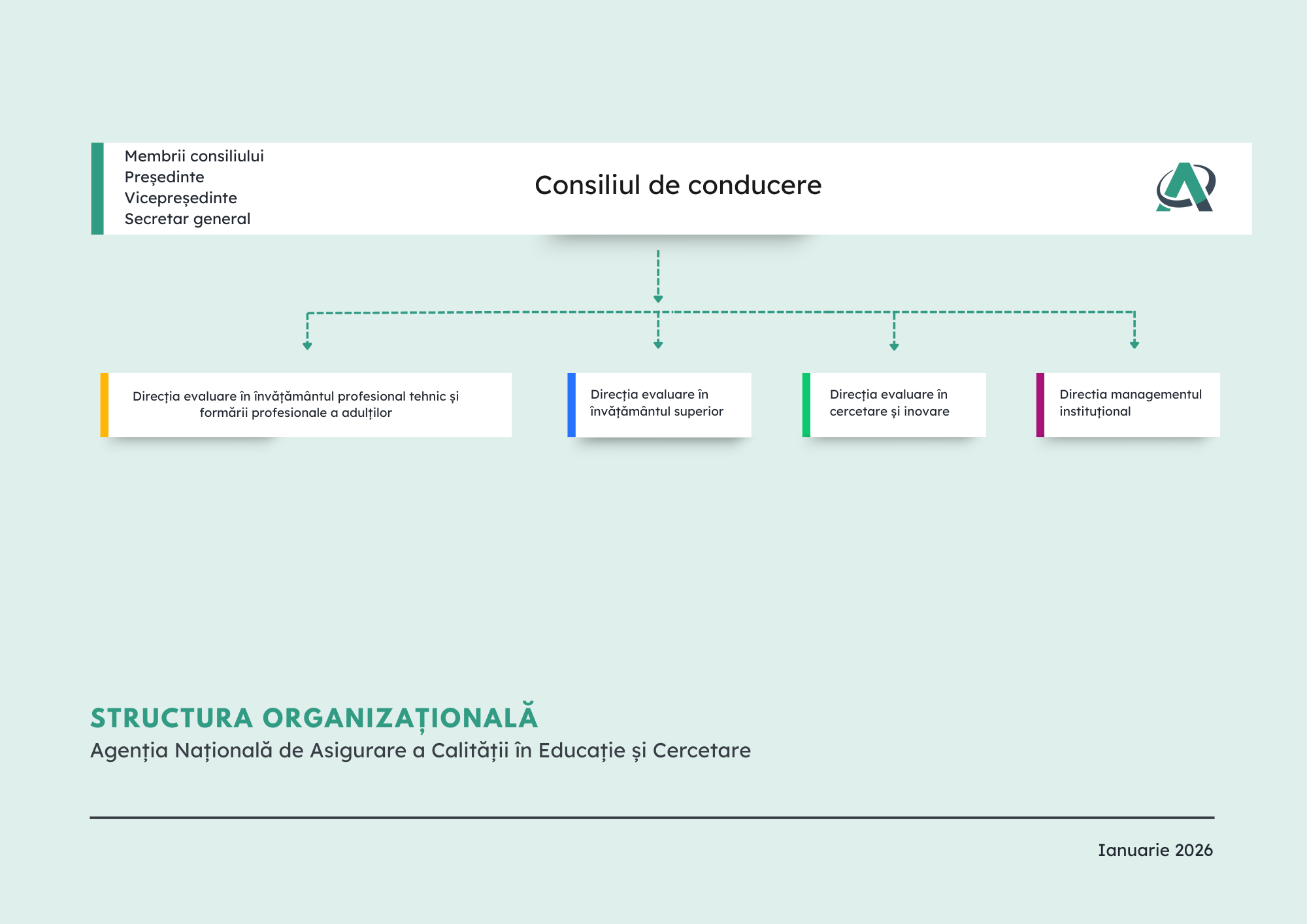Conform Regulamentului de organizare și funcționare, Agenția Națională de Asigurare a Calității în Educație și Cercetare este constituită din: